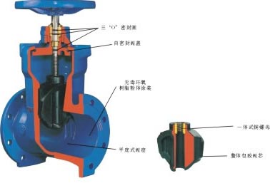 結構特點(diǎn) 1.整體閥蓋暗桿設計,結構緊湊;閥桿螺母與閘板兩體結構,無(wú)卡阻現象發(fā)生;直通道,無(wú)泄留凹腔;閥桿密封采用“O”形密封圈。 2.有優(yōu)秀的防腐性能,殼體內,外表面噴涂環(huán)氧樹(shù)脂,需要時(shí)內表面襯搪瓷;連接螺栓采用內六角螺栓,頂部膠封。 3.可靠的衛生性環(huán)氧樹(shù)脂符合衛生標準GB/T17219-1998,閘板整體包覆符合衛生檢驗的橡膠;閥桿、閥桿螺母等零件采用不受水腐蝕的不銹鋼或青銅等到材料。 適用飲用水、給排水、污水處理、天然氣與煤氣、工業(yè)以及食品等行業(yè)。
